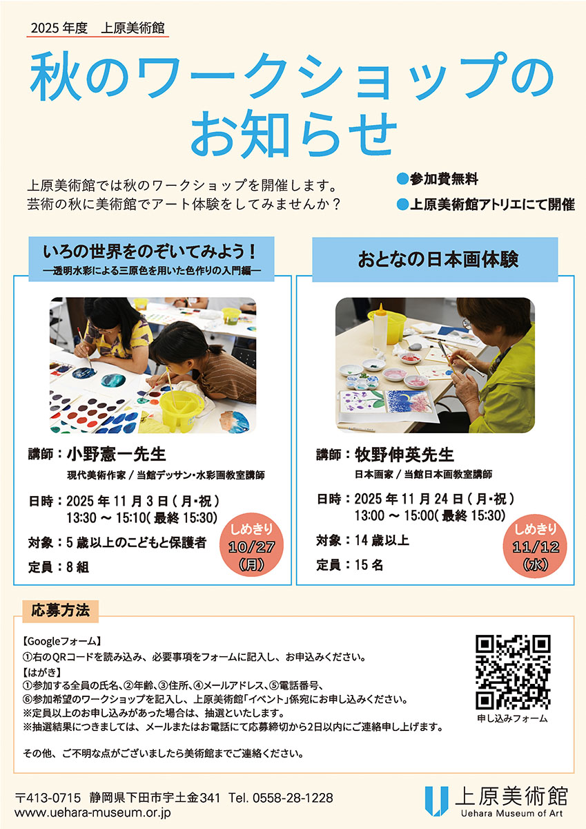 上原美術館では秋のワークショップを開催します。 芸術の秋に美術館でアート体験をしてみませんか?